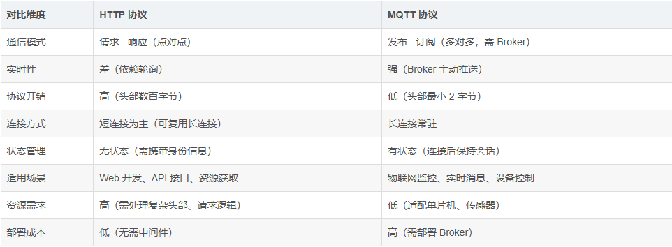 在物联网、移动互联网等领域,MQTT与HTTP是两种应用广泛的网络协议,二者在设计目标、通信模式、性能特性上差异显著,分别适用于不同场景。以下从核心定义、协议架构、关键特性、应用场景等维度展开详解,并对比二者核心差异。 一、HTTP协议:面向“请求-响应”的通用应用层协议HTTP(HypertextTransfe...