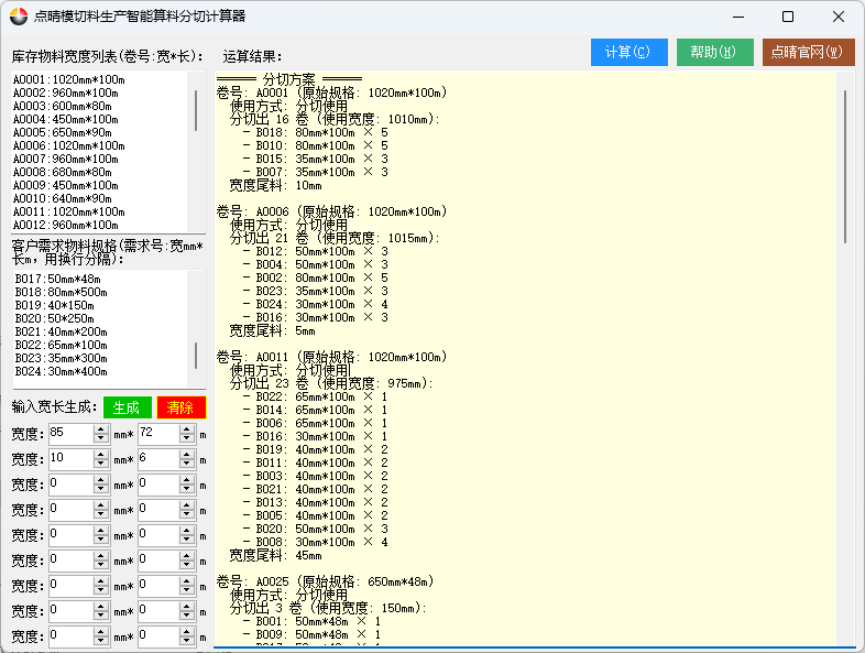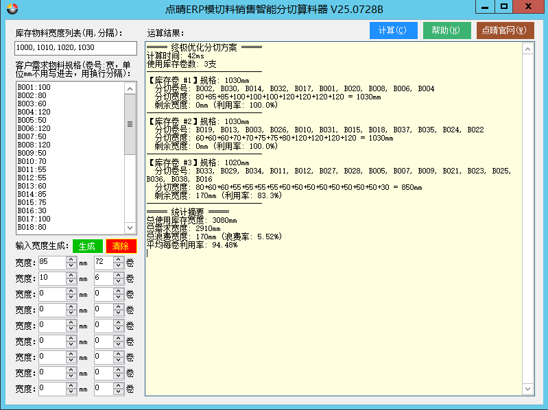 点晴ERP模切料销售智能分切算料器,是深圳市点晴信息技术有限公司专门为模切行业推出的一款模切材料销售分切管理智能算料的程序(从点晴模切ERP系统贸易版中剥离出来为一个可以独立运行的程序),可以快速高效的给出最佳分切用料结果,实现最小分切卷数、最少浪费的目标。支持逾百个原始在库物料规格设置、几千卷不同规格的购买物料需求在...