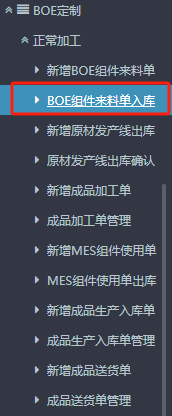 1.进入ERP系统之后,在左侧的功能菜单里下方可以找到“BOE定制”,点击后找到“正常加工”。然后点击打开“新增BOE组件来料单”。