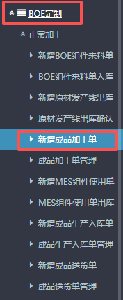进入ERP系统之后,在左侧的功能菜单里找到“BOE定制”,点开“正常加工”,点击“新增成品加工单”。