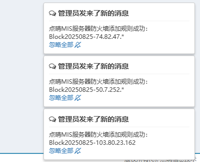 这是点晴OA系统安全性措施,检测到来访者有攻击行为时,就会将其IP加入Windows系统防火墙黑名单,彻底杜绝其继续攻击的行为。但这个IP不是永久封锁的,一般是7天后会释放,所以你会看到不断有新的IP被加...