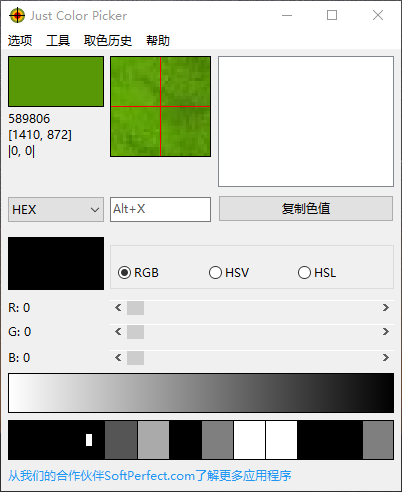 JustColorPicker(屏幕取色小工具)功能:一款便携式取色工具,支持捕捉屏幕任意位置颜色,格式涵盖HEX、RGB、HSB/HSV、HSL、CMYK、TColor等,还可冻结画面、锁定采样点、放大取色、生成渐变与配色方案,并支持导入导出Photoshop.aco或GIMP.gpl调色板。优点:永久免费,无需安装...