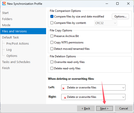 File exists on Left and Right, and are different,选择“Always copy from Left to Right”,意思是如果文件在两边都存在并且不同时,则永远只从左边复制到右边;