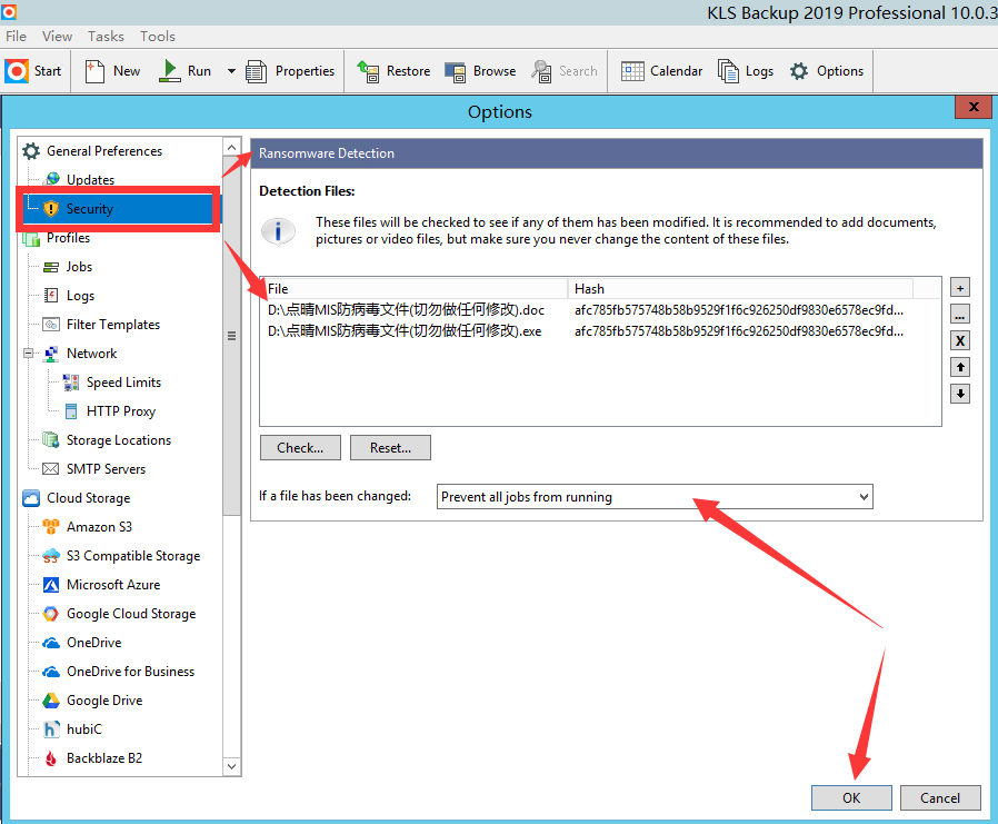 安装完毕后,务必开启以下功能:Tools-》Option-》General Preferences->Security,选择至少两个文件(一个程序、一个Office文档)监控,但检测到文件被更改时选择“Prevent all jobs from running”(停止所有运行中的任务),避免备份被勒索病毒等破坏。