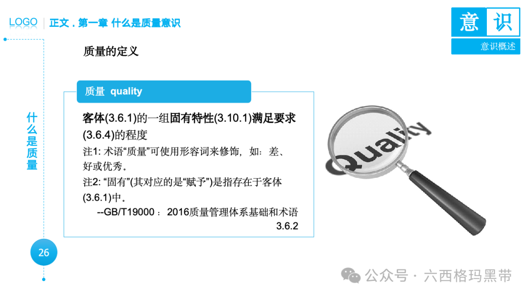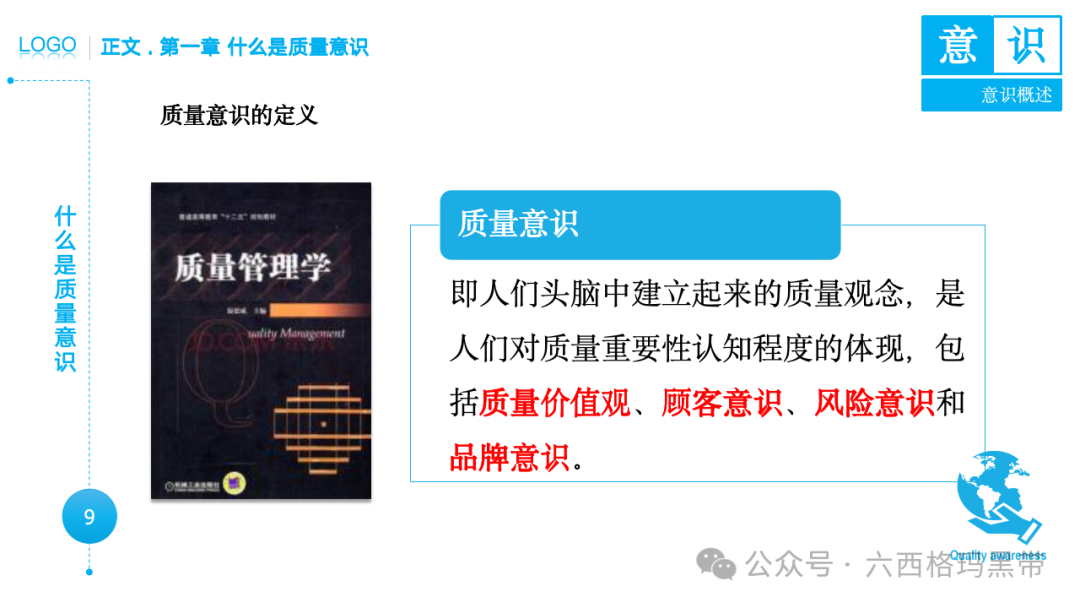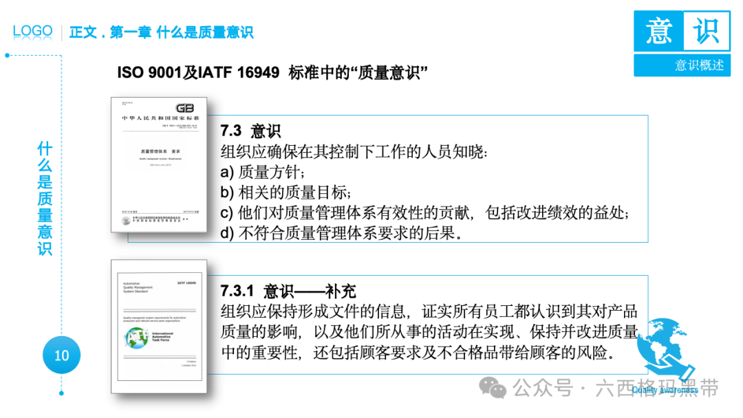 • 认识:意识首先是对外界事物的认知。例如,员工在生产线上看到一个零件,能够识别出它是产品的组成部分,并且知道它应该符合什么样的质量标准。