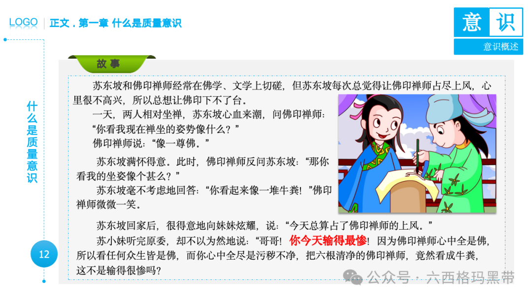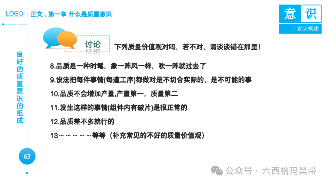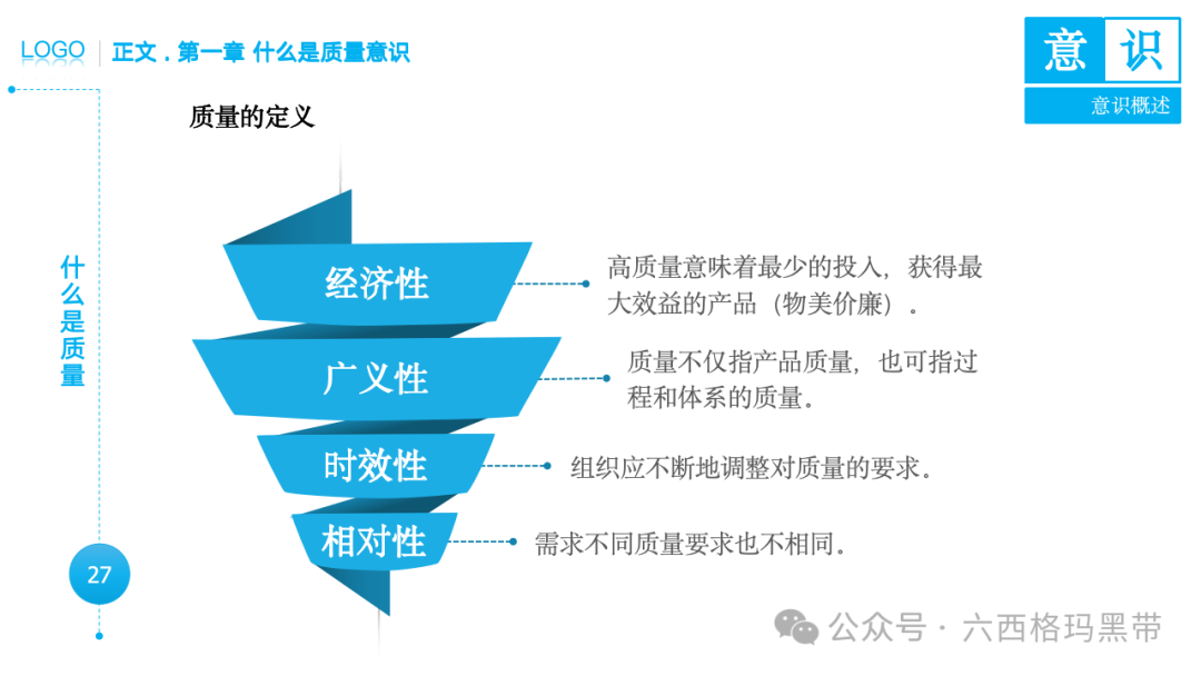 • 广义意识:包括认知(知)、情感(情)和意志(意)三个方面。例如,员工在工作中不仅需要知道质量标准(认知),还需要对质量工作有积极的情感(情感),并且有意愿去执行质量标准(意志)。