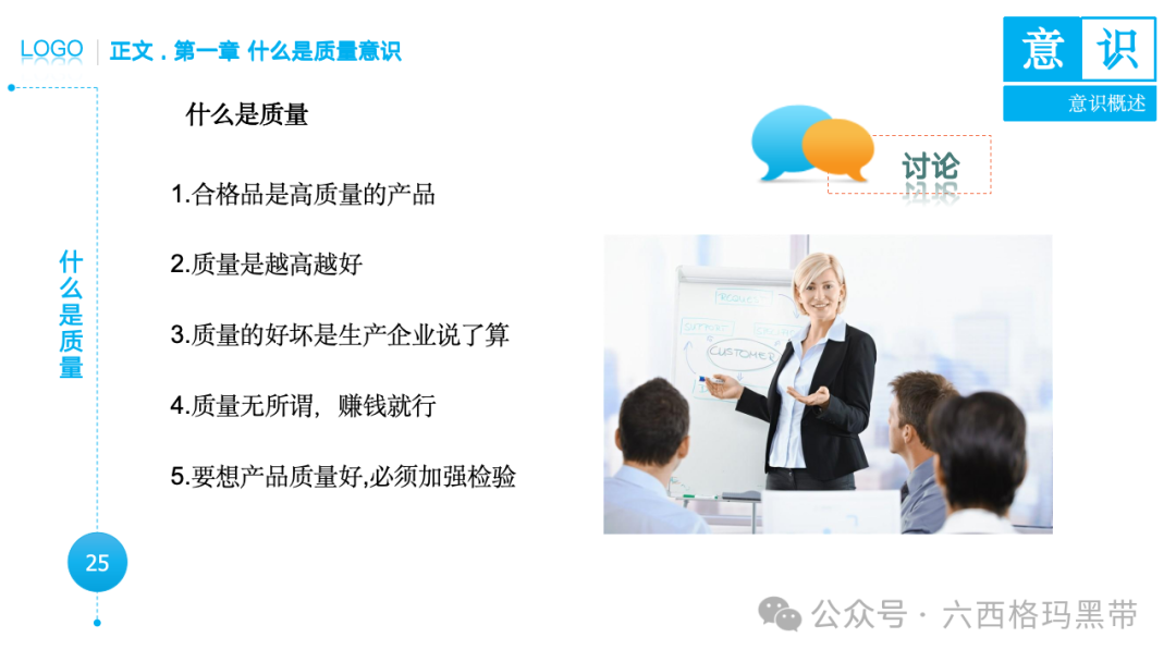 • 狭义意识:是指人们对周围环境和自身行为的觉察和关注。例如,一个有质量意识的员工会时刻关注自己工作中的质量细节,而一个质量意识弱的员工可能对这些问题视而不见。