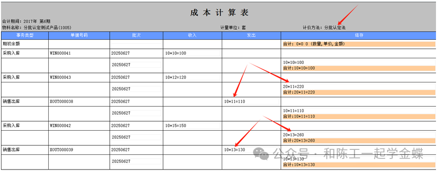 5.分批认定法: 5.1计算公式:出库成本单价=同一批次(期初金额+本次出库前收入金额)/(期初数量+本次出库前收入数量) 5.2 计算结果:6.5号的出库取1号2号的加权平均成本11块,6.15号的出库取10号的结存金额和10号的加权平均单价13块