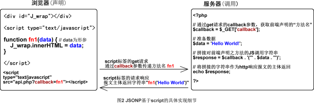 这个方案乍看之下似乎有两个问题,一个是这个“JS方法”是如何实现前后端同步的? 再就是后端服务器上的动态脚本执行环境怎么能调用前端浏览器上声明的JS方法呢? 这里先回答第二个问题。那就是在这个情景下,说JS方法由后端调用,并不等于说执行也是后端在做。 事实是,虽然调用是后端,但执行其实还是在前端浏览器中。 而实现这种调用与执行的分离,以及实现“JS方法”的同步,都是靠的一个相同的手段,那就是HTML的 script 标签。 这个script标签原本是用来通过http请求加载静态的JavaScript脚本资源的。可是某个老六突发奇想,用script加载起动态的JavaScript脚本,然后就诞生了JSONP的通信方式。 这里说的所谓“静态的JavaScript脚本资源”,说的是放在服务器磁盘上一成不变的JavaScript文本资源,谁请求都是得到一个相同的副本,就像提前做好的预制菜一样。 而所谓“动态的JavaScript脚本资源”,就是说JavaScript文本资源并不是现成的,请求实际是发向一个后端运行的“动态脚本”,比如PHP、JSP之类的。然后JavaScript脚本则是由这些后端脚本再根据具体情况按需生成,整体而言就像“点菜现炒”。 具体说就是,这个“后端脚本”会根据http请求的具体参数的不同响应返回不同的JavaScript脚本文本给浏览器端来执行。 于是,那个计划由“前端声明后端调用”的JS方法的方法名便由前端创建,并由script标签发起的http请求的get参数同步给了后端。 接着,后端脚本则根据得到的JS方法名拼接一个对该方法进行调用的JavaScript脚本片段,并将要传输给前端的数据作为此次调用的实参。 最后,这个由后端拼接的、带着实参的“JS方法调用片段”便通过前端script标签发起的http请求的响应报文从服务器返回给浏览器,并在浏览器端自动执行。