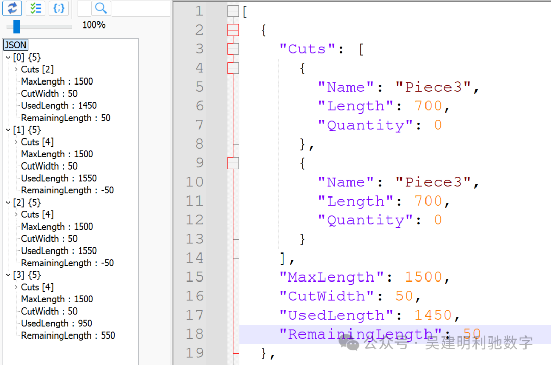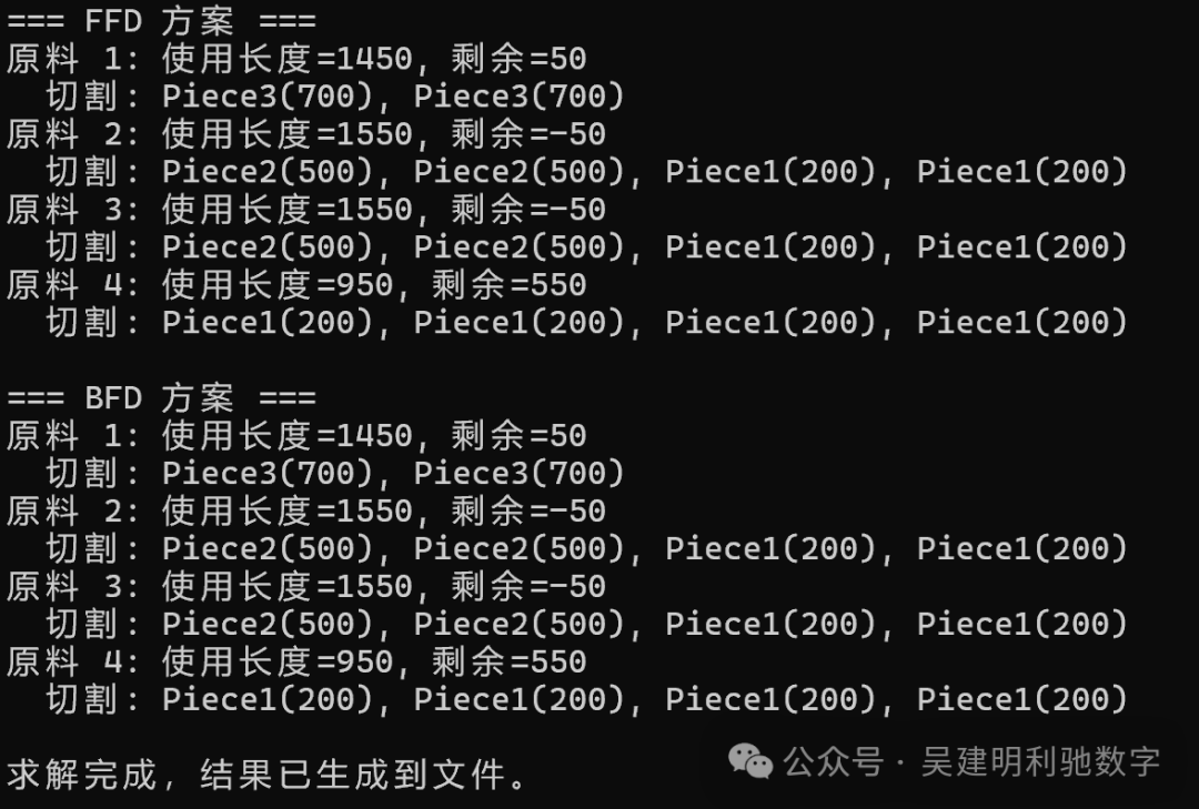 三、测试驱动实现 数据模型 public class JobItem { public string Name { get ; set ; } public int Length { get ; set ; } public int Quantity { get ; set ; } } public class Job { public int MaxLength { get ; set ; } public int CutWidth { get ; set ; } public List<JobItem> TargetSizes { get ; set ; } } public class Stock { public List<JobItem> Cuts { get ; set ; } = new List<JobItem>(); public int MaxLength { get ; set ; } public int CutWidth { get ; set ; } public int UsedLength => Cuts.Sum(c => c.Length) + (Cuts.Count - 1 ) * CutWidth; public int RemainingLength => MaxLength - UsedLength; } FFD 算法实现 public static List<Stock> SolveFFD ( Job job ) { var sizes = job.TargetSizes .SelectMany(s => Enumerable.Repeat(s, s.Quantity)) .OrderByDescending(s => s.Length) .ToList(); List<Stock> stocks = new List<Stock>(); foreach ( var item in sizes) { bool placed = false ; foreach ( var stock in stocks) { if (stock.RemainingLength >= item.Length) { stock.Cuts.Add(item); placed = true ; break ; } } if (!placed) { stocks.Add( new Stock { MaxLength = job.MaxLength, CutWidth = job.CutWidth, Cuts = new List<JobItem> { item } }); } } return stocks; } BFD 算法实现 public static List<Stock> SolveBFD ( Job job ) { var sizes = job.TargetSizes .SelectMany(s => Enumerable.Repeat(s, s.Quantity)) .OrderByDescending(s => s.Length) .ToList(); List<Stock> stocks = new List<Stock>(); foreach ( var item in sizes) { Stock bestStock = null ; int minRem = int .MaxValue; foreach ( var stock in stocks) { if (stock.RemainingLength >= item.Length && stock.RemainingLength - item.Length < minRem) { minRem = stock.RemainingLength - item.Length; bestStock = stock; } } if (bestStock != null ) { bestStock.Cuts.Add(item); } else { stocks.Add( new Stock { MaxLength = job.MaxLength, CutWidth = job.CutWidth, Cuts = new List<JobItem> { item } }); } } return stocks; } 文件驱动主程序 using System.Text.Json; class Program { static void Main () { string inputPath = "job.json" ; string outputFFD = "output_ffd.json" ; string outputBFD = "output_bfd.json" ; Job job = JsonSerializer.Deserialize<Job>(File.ReadAllText(inputPath)); var ffdStocks = SolveFFD(job); var bfdStocks = SolveBFD(job); File.WriteAllText(outputFFD, JsonSerializer.Serialize(ffdStocks, new JsonSerializerOptions { WriteIndented = true })); File.WriteAllText(outputBFD, JsonSerializer.Serialize(bfdStocks, new JsonSerializerOptions { WriteIndented = true })); Console.WriteLine( "FFD 和 BFD 求解完成,输出已生成。" ); } } 输入示例 ( job.json ) { "MaxLength" : 1500 , "CutWidth" : 50 , "TargetSizes" : [ { "Name" : "片段1" , "Length" : 200 , "Quantity" : 8 } , { "Name" : "片段2" , "Length" : 500 , "Quantity" : 4 } , { "Name" : "片段3" , "Length" : 700 , "Quantity" : 2 } ] } 输出 四、总结与扩展 1. 核心思想 :通过启发式算法快速生成合理的切割方案,节省原料。 3. 适用范围 :中小规模问题完全可用;大规模或特殊约束可以引入列生成、整数规划优化。 4. C# 测试文件驱动实现 :便于生产现场直接读取订单数据文件生成切割方案,同时可扩展为 Web API 或 GUI 工具。