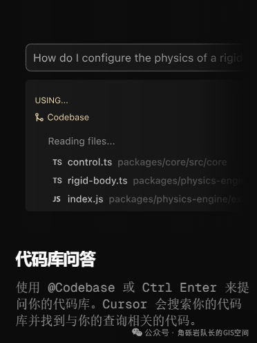使用 @Codebase 或 Ctrl Enter 来提问你的代码库。Cursor 会搜索你的代码库并找到与你的查询相关的代码。 ⑥常用快捷键