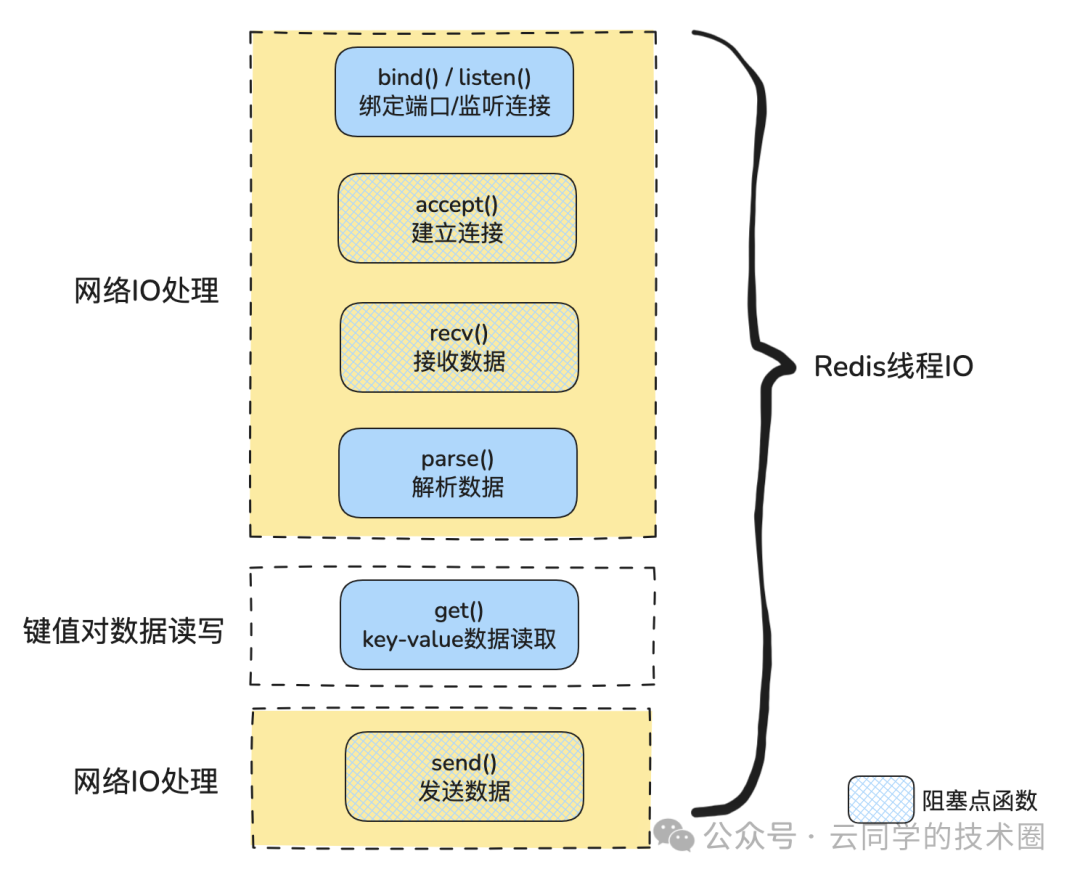 2、非阻塞模式设置 上述函数中, bind() 绑定地址和端口,是本地操作,几乎瞬间完成。 listen() 将套接字转换为监听状态,也是一个本地内核操作,立即返回。 parse()和get() 都偏向于应用层逻辑。 但在默认情况下,accept()、recv()、send()是阻塞模式的,也就是说,当 Redis 监听到一个客户端有连接请求,但一直未能成功建立起连接时,会阻塞在 accept() 函数这里,导致其他客户端无法和 Redis 建立连接。类似的,当 Redis 通过 recv()/send() 从一个客户端读取或返回数据时,如果数据一直没有到达或返回,Redis 也会一直阻塞在 recv()/send()。 不过,幸运的是,socket 网络模型本身支持非阻塞模式。 在网络 I/O 处理中,将套接字(Socket)设置为非阻塞模式,主要影响的是那些需要“等待”网络事件的函数。 一个套接字一旦通过 fcntl() 或 ioctl() 设置为非阻塞模式,所有作用于该套接字上的 I/O 函数都会变成非阻塞的。 (1)accept() - 接受连接