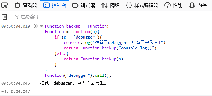 如果想要拦截debugger,是不容易的,常用的函数替代、proxy方法均对它无效,如: