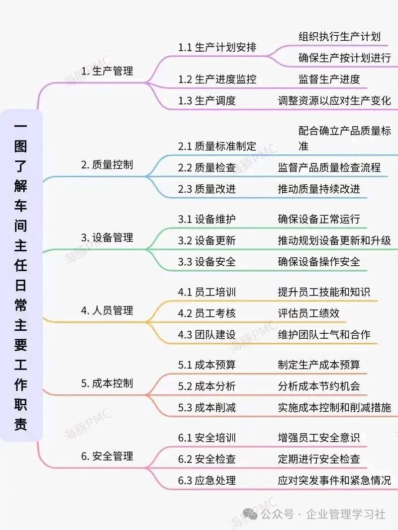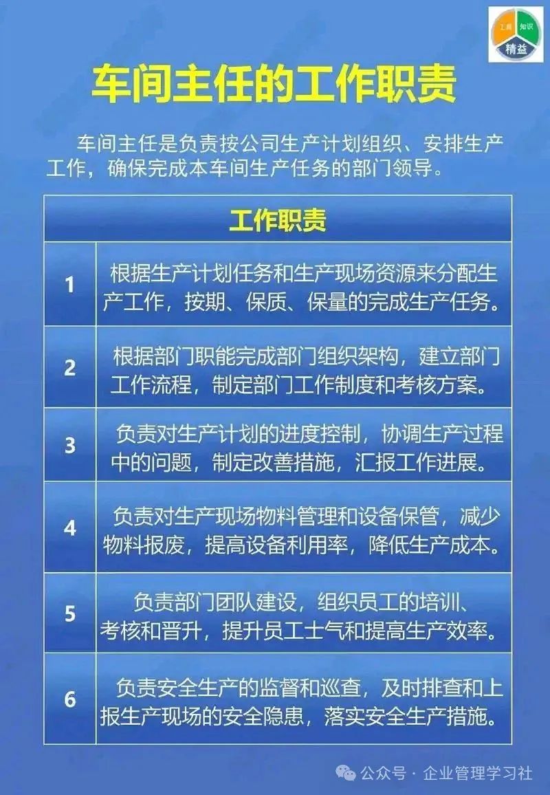 核心定位:车间主任是承上启下的“顶梁柱” 对上:接住公司目标(产量、质量、成本、交付、安全),分解落实,扛起责任。 对下: 带领班组长和车间工人,把目标干出来,解决现场千头万绪的问题。 横向:跟计划、采购、设备、质量、工艺、仓储等部门“拧成一股绳”,别让车间成孤岛。 核心就一条:确保车间安全、高效、稳定地输出合格产品,并且成本可控。
