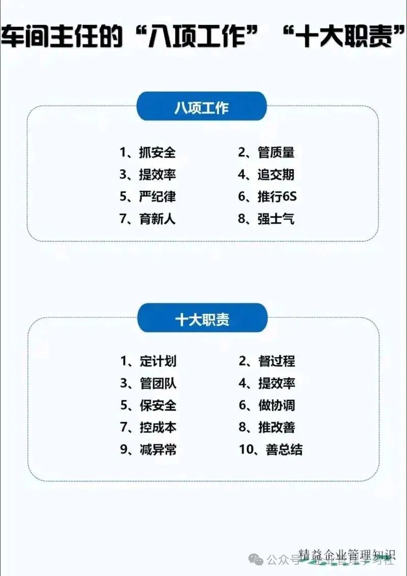 车间主任落地管理的“三板斧”与“三颗心” 三板斧: 1. 走动管理: 办公室待不住!每天至少60%时间在现场。看、听、问、查。问题在现场,答案也在现场。 2. 数据驱动:别凭感觉管理。用数据发现问题、分析问题、衡量效果、评价绩效。让管理更客观。 3. 聚焦关键:千头万绪,要抓主要矛盾。每天问问自己:今天哪三件事对车间目标影响最大?优先解决它!别被琐事淹没。 三颗心: 1. 责任心:对安全、质量、员工、结果负责到底。这是底线。 2. 公心:公平公正处理人和事。心底无私天地宽,才能服众。 3. 恒心:管理是细水长流。5S、安全、质量、改善… 都不是一蹴而就,需要日复一日的坚持和较真。咬定青山不放松。