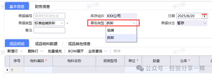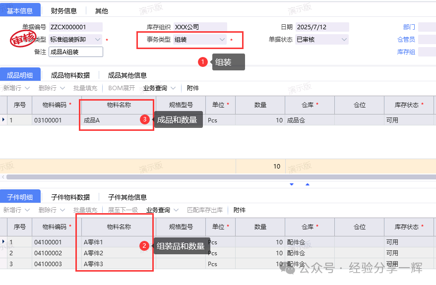 组装拆御单:简化生产流程,审核后更新库存。 组装单:事务类型(组装),(例如:A零件1+2+3,各10个,配件仓),组装成(成品A,10个,成品仓)。审核确认后触发库存调整。