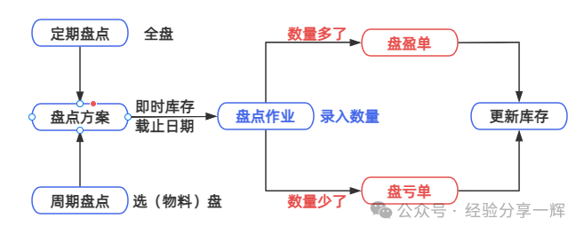 定期盘点(全盘)和周期盘点(物料按ABC分级)。 流程:新增盘点方案--(实地盘点)--盘点作业(录入数量)--根据差异自动生成《盘盈单》或《盘亏单》,审核确认后触发库存调整。