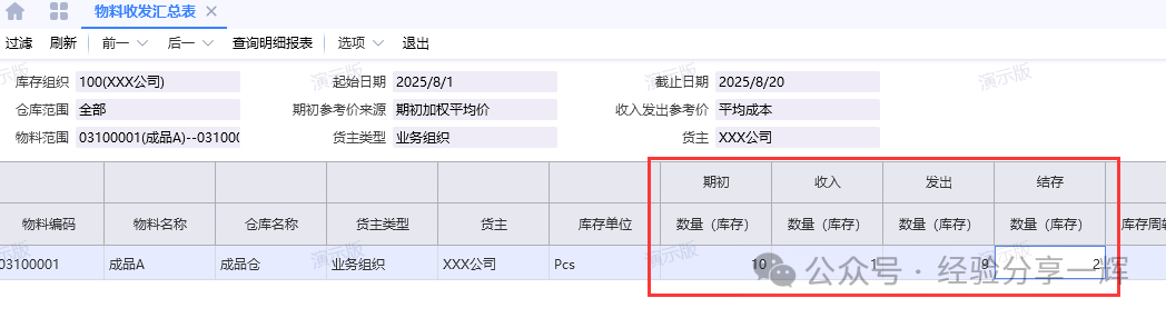 查看期初,收入,发出,结存的数量,双击可看出入库单据的明细。