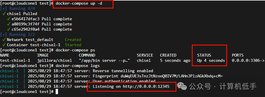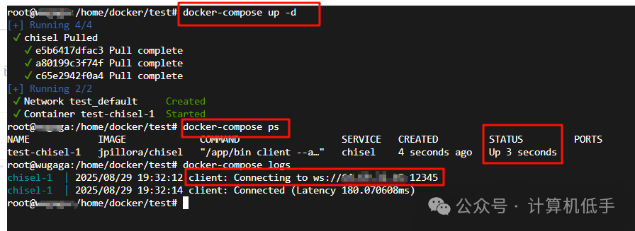 - • 上面Docker示例启动成功之后,可以通过公网服务器间接访问到内网服务