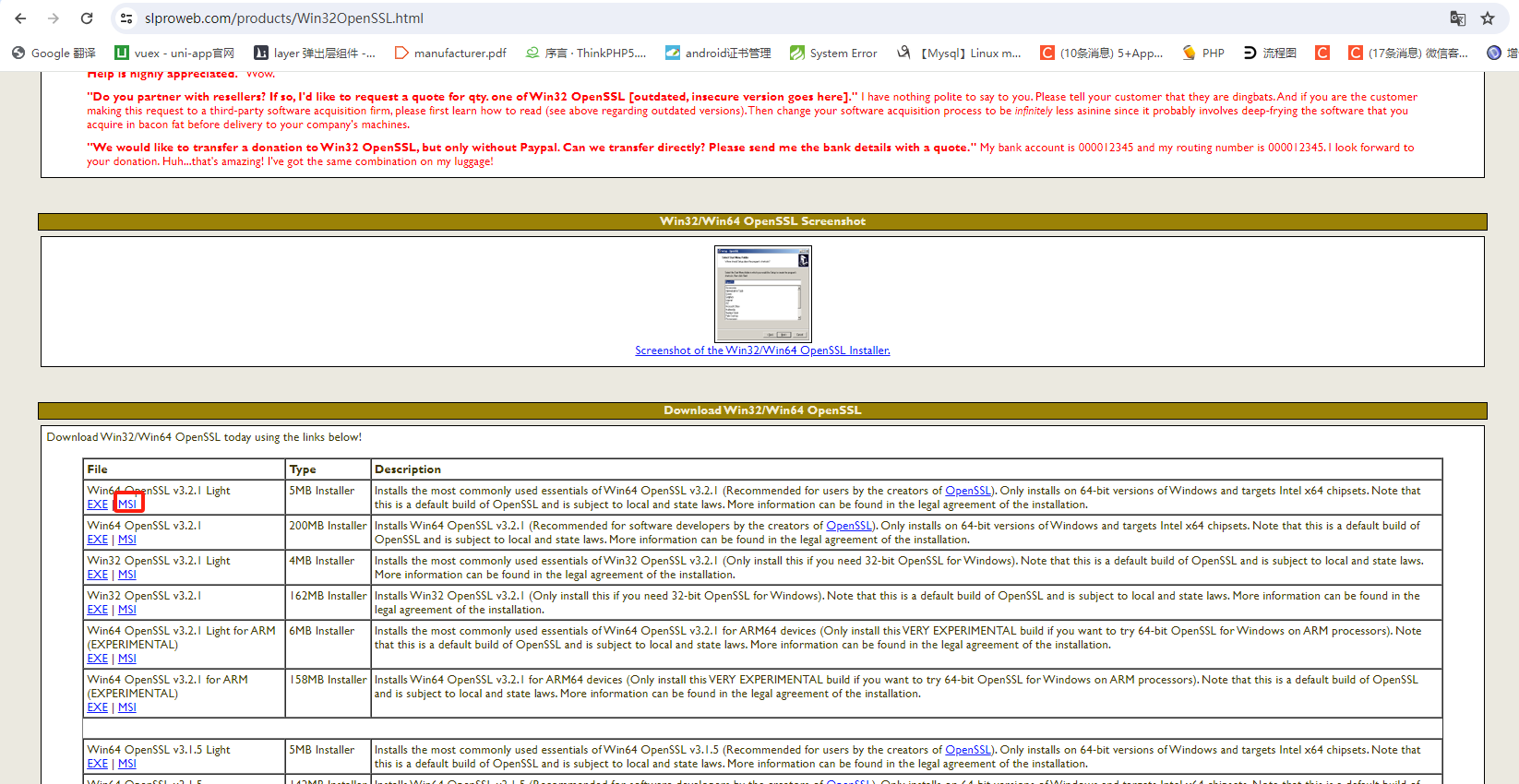 安装方法步骤一前往网站下载:Win32/Win64 OpenSSL Installer for Windows - Shining Light Productions