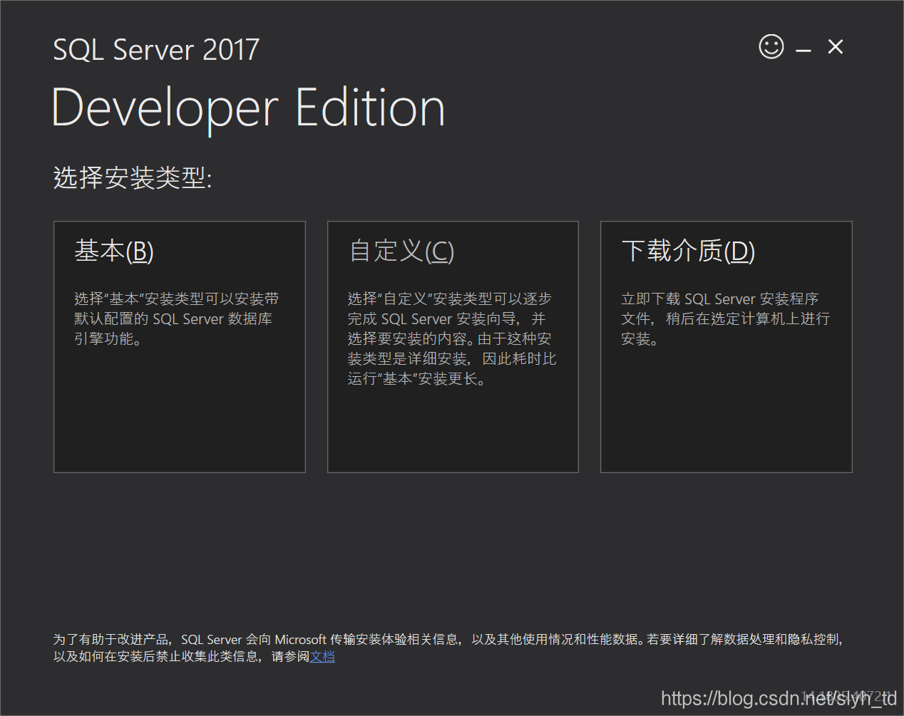 SQL Server 2017下载内容分为两部分SQL Server 2017 Developer和SQLserver Mamngement Studio 一、SQL Server 2017 Developer1.官网下载SQL Server 2017 Developer https://www.microsoft.com/zh-cn/sql-server/sql-server-downloads