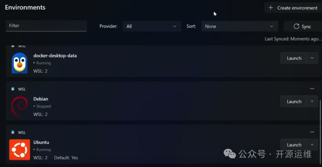 安装完成后,WSL会下载默认的Ubuntu环境,也可以用如下命令查看支持的其他Linux发行版: