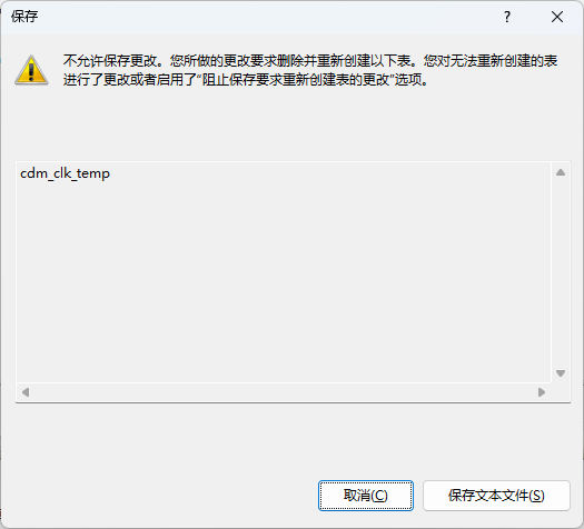 不允许保存更改。您所做的更改要求删除并重新创建以下表。您对无法重新创建的表进行了更改或者启用了“阻止保存要求重新创建表的更改“选项。