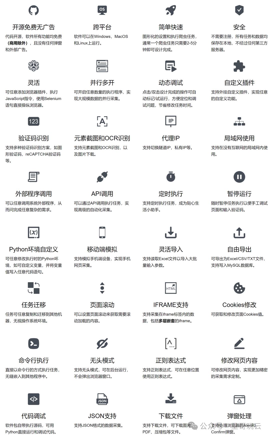 什么是EasySpider一个完全免费(包括商业使用和二次开发)的可视化浏览器自动化测试/数据采集/爬虫软件,可以使用图形化界面,无代码可视化的设计和执行任务。只需要在网页上选择自己想要操作的内容并根据提示框操作即可完成任务的设计和执行。同时软件还可以单独以命令行的方式进行执行,从而可以很方便的嵌入到其他系统中。 软件特性如图。