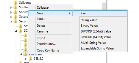如果未在protocol的路径下发现TLS1.2,TLS1.1,TLS1.0,则需要我们先手动创建 New-->Key