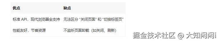 Page Visibility API 处理标签页切换场景。 - 数据上报:结合