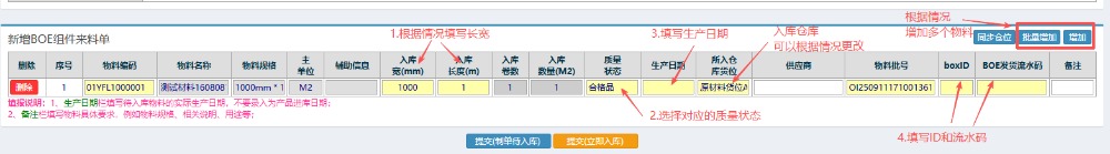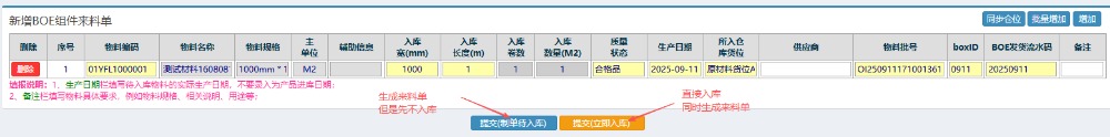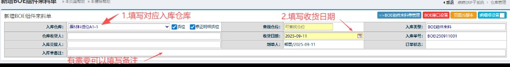 2.进入“新增BOE组件来料单”界面后,先填写好基本的信息:入库仓库、收货日期。 以及有需要的话可以根据情况填写来料的备注信息。