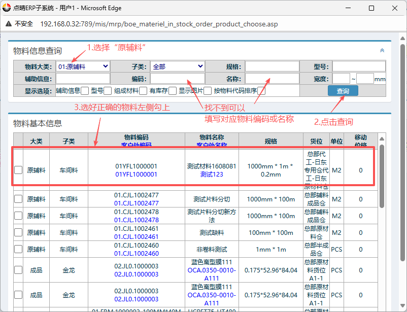 按照图里的顺序在物料大类选择“原辅料”,然后点击查询(如果找不到的话可以填写对应的编码和名称)。