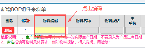 3.填写BOE组件来料单的信息,首先点击“物料编码”,接着就会弹出查询物料的窗口。
