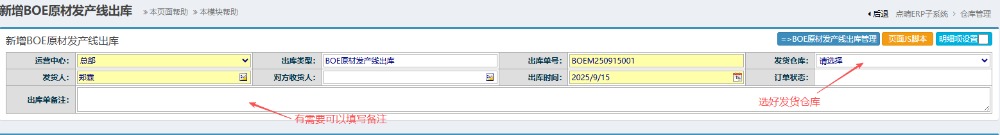 2.进入界面之后,按图操作,选择好发货仓库(备注的话根据情况填写)。