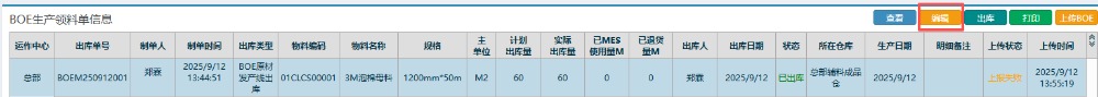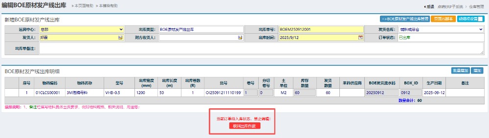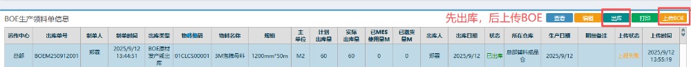 7.查询出来后,找到对应的物料信息,确认是否已经出库。待出库的话就按图操作:审核确认出库,然后再进行BOE上传