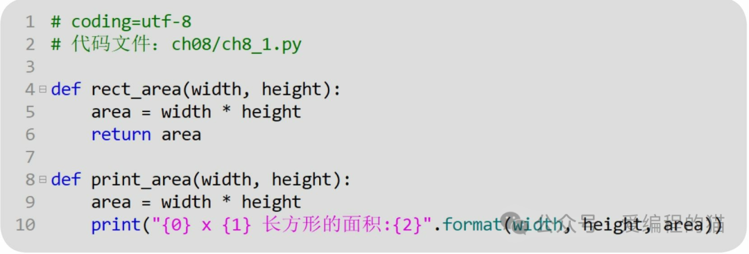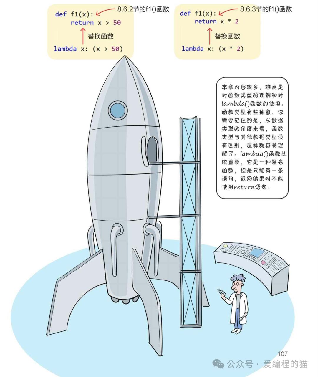 我们之前学习的函数都是有名称的函数,例如在8.1节定义的rect_ar ea()函数,rect_area就是其函数名。我们也可以定义匿名函数,匿名 函数就是没有名称的函数。