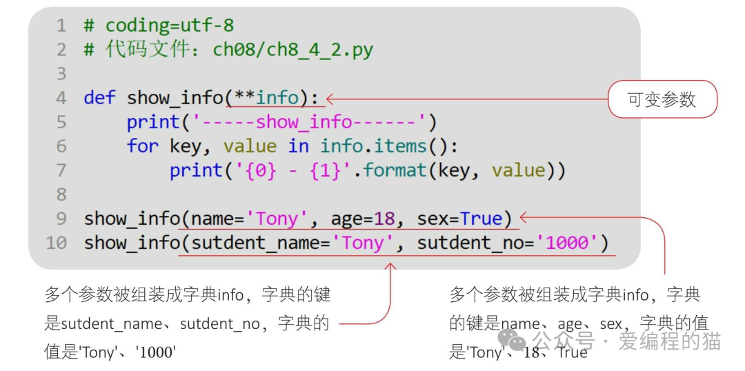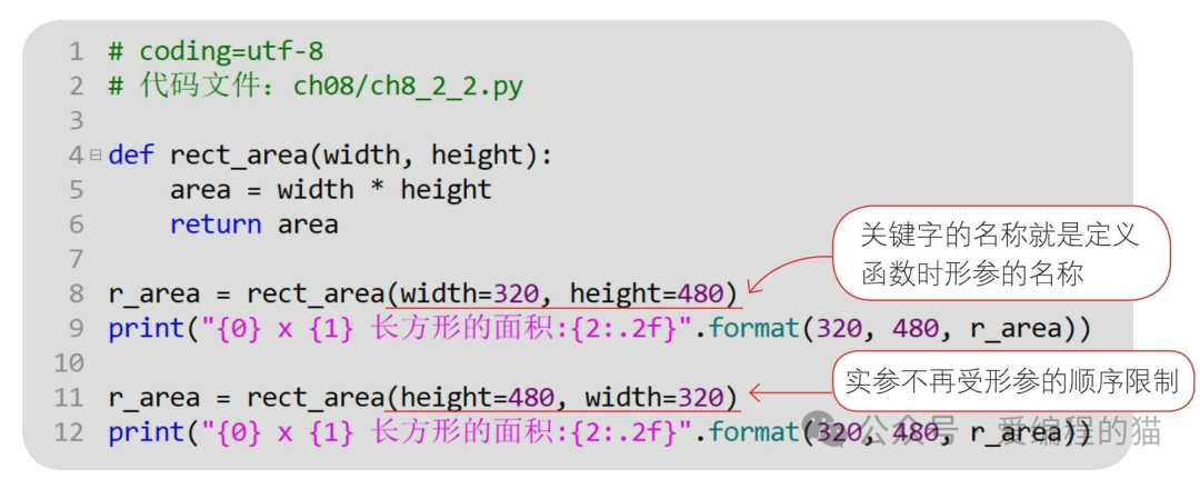 在调用函数时可以采用“关键字=实参”的形式,其中,关键字的名称就是定义函数时形参的名称。