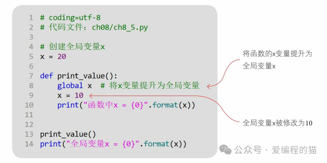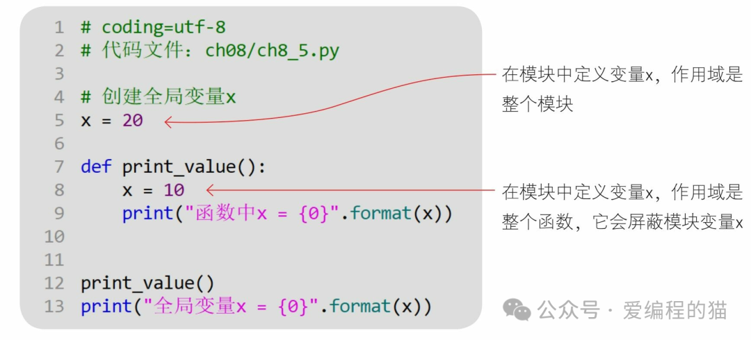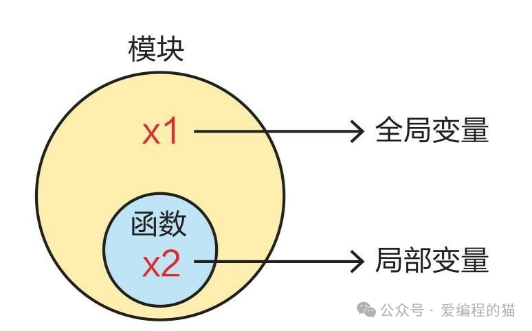 变量可以在模块中创建,作用域(变量的有效范围)是整个模块, 被称为全局变量。变量也可以在函数中创建,在默认情况下作用域是整 个函数,被称为局部变量。