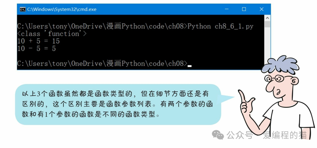 lambda()函数与有名称的函数一样,都是函数类型,所以8.6.1节 的add()和sub()函数可以被lambda()函数替代。修改8.6.1节的代 码示例如下: