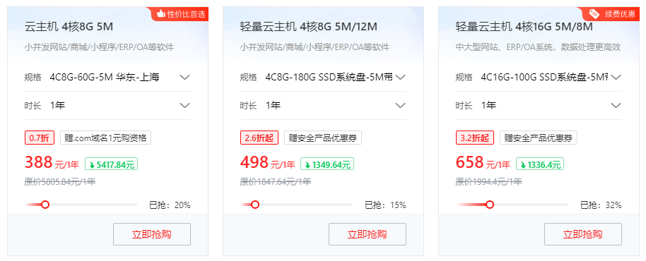 下面这几款限时特惠云服务器,配置实用、价格亲民,部分支持续费不涨价,无论是个人开发者还是中小企业,都能放心入手,一步到位。 一、阿里云 —— 新用户首选,续费同价真香 如果你是第一次接触云服务,阿里云是稳妥可靠的选择。活动力度大、系统成熟、稳定性强,更重要的是——部分套餐支持续费价格与首年一致,这个“隐藏福利”很多老用户都没注意到。 推荐套餐一:轻量应用服务器 2核2G + 200M峰值带宽 推荐套餐二:2核2G3M + 40G SSD(买2年) 企业优选套餐:2核4G5M + 80G SSD