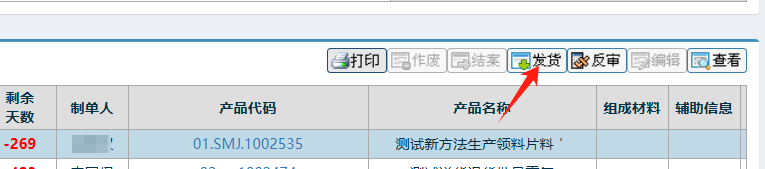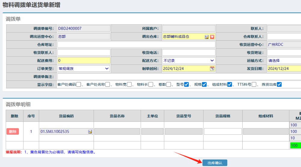 :点晴ERP-调拨出库单-发货操作![]() 点击进入 如下图; 点击一条信息后,背景变色后,点击发货按钮 如下图: