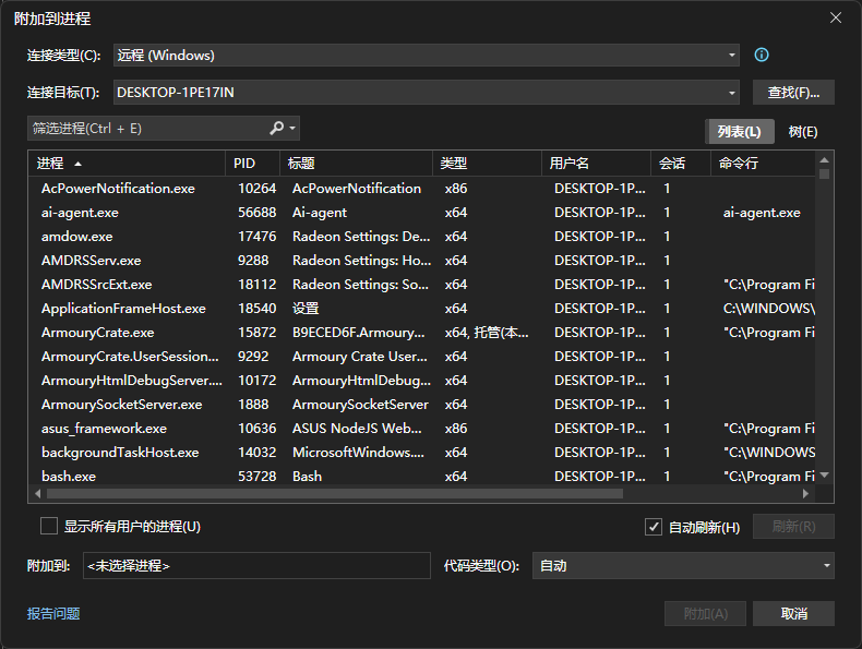 • 远程服务器名称:目标机器名称。msvsmon.exe 日志显示的名称,如 DESKTOP-RNT4TEI;这里也可以 IP+端口形式连接
