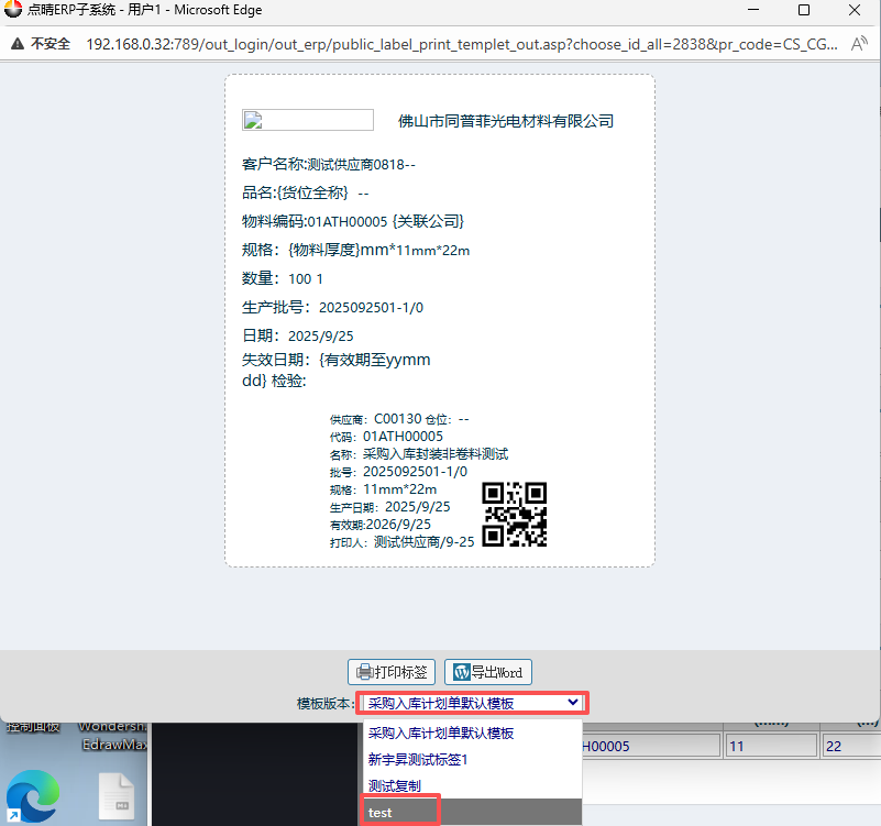 7.在二维码标签界面内,模板选择“test”,点击打印标签。然后就会弹出打印预览界面。