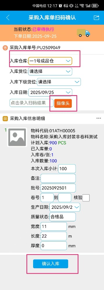 9.手机点击“按采购入库单扫码确认”进去后,点击“摄像头”,对刚才的打印预览界面内的二维码进行扫码操作。 然后手机app内下方就会显示采购入库信息明细,接着要记得选择入库仓库,最后点击确认入库。