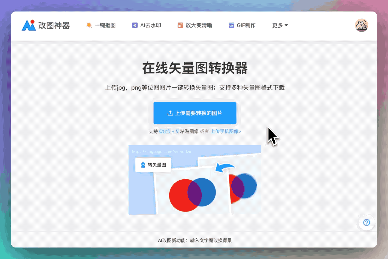 但是如果你希望对Logo组成元素或色彩进行编辑,就需要将Logo图片转换成通用的矢量图格式了,这里推荐转换成SVG矢量图格式,不同于AI等格式,SVG文件不仅小且容易保存,而且可以用AI改图神器的矢量图转换器直接在线转换,操作简单,还不用下载其他软件,非常方便。