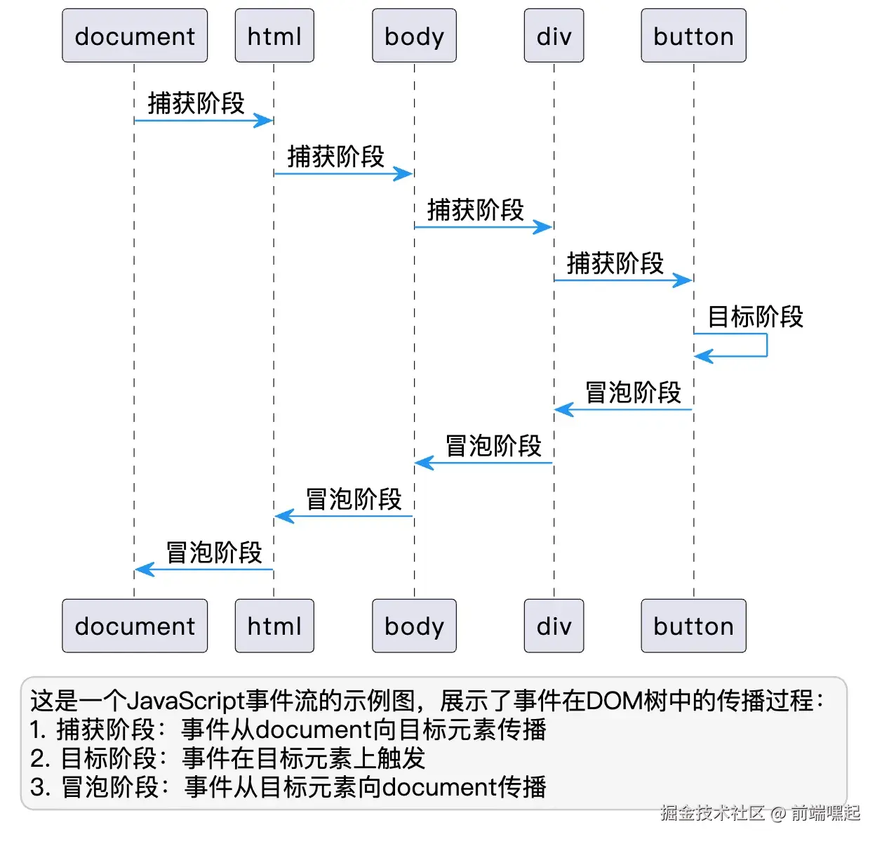 在前端开发的世界里,事件处理是构建交互式网页的核心机制。从用户点击按钮到页面响应,从表单验证到动态内容更新,都离不开事件系统的支持。然而,事件处理并不是一成不变的,它经历了从简单到复杂、从粗糙到精细的演进过程。今天,我们就来深入探讨JavaScript事件流的奥秘,从DOM0级事件到DOM3级事件,看看它们是如何一步步完善,最终成为现代Web开发不可或缺的一部分。 前言JavaScript事件流描述的是从页面中接收事件的顺序。在浏览器发展的早期,不同的浏览器厂商对事件流的理解并不一致,这就导致了兼容性问题。随着Web标准的推进,事件流逐渐规范化,形成了我们今天所熟知的三个阶段:事件捕获、目标阶段和事件冒泡。 为了更好地理解事件流的工作原理,我们先来看一张总览图,它展示了事件在DOM树中的传播路径: