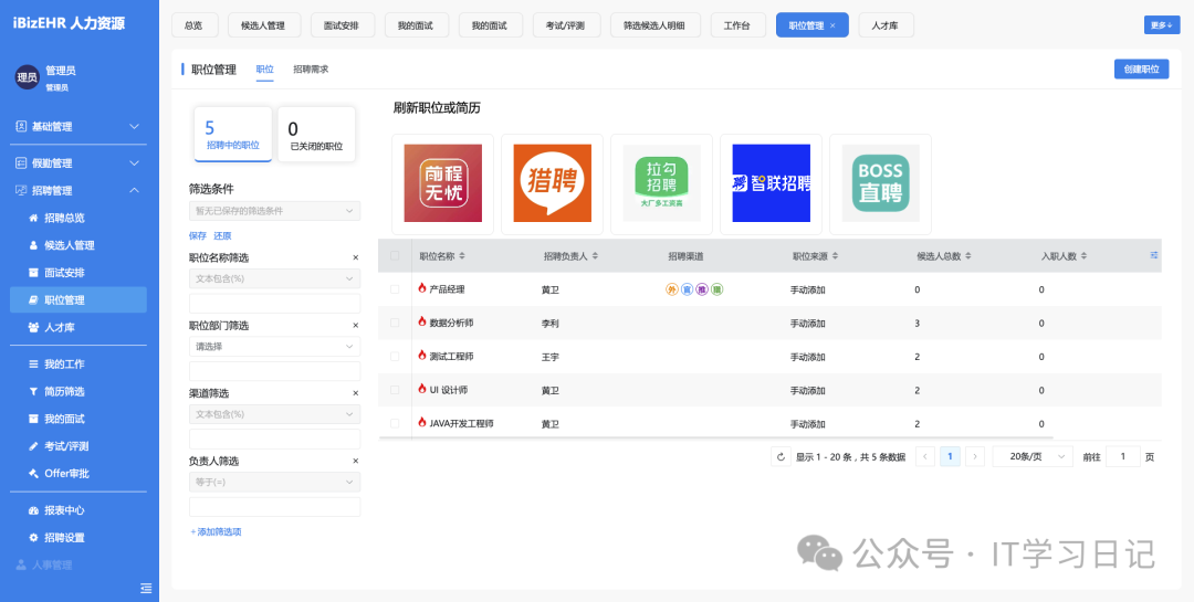 • 职位管理:职位模板、岗位描述、发布渠道管理。
