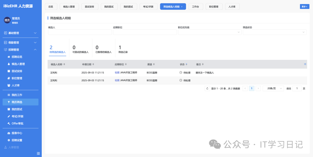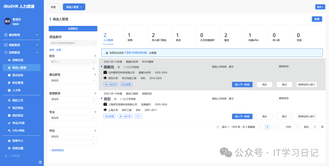 • 简历筛选、面试安排、录用审批