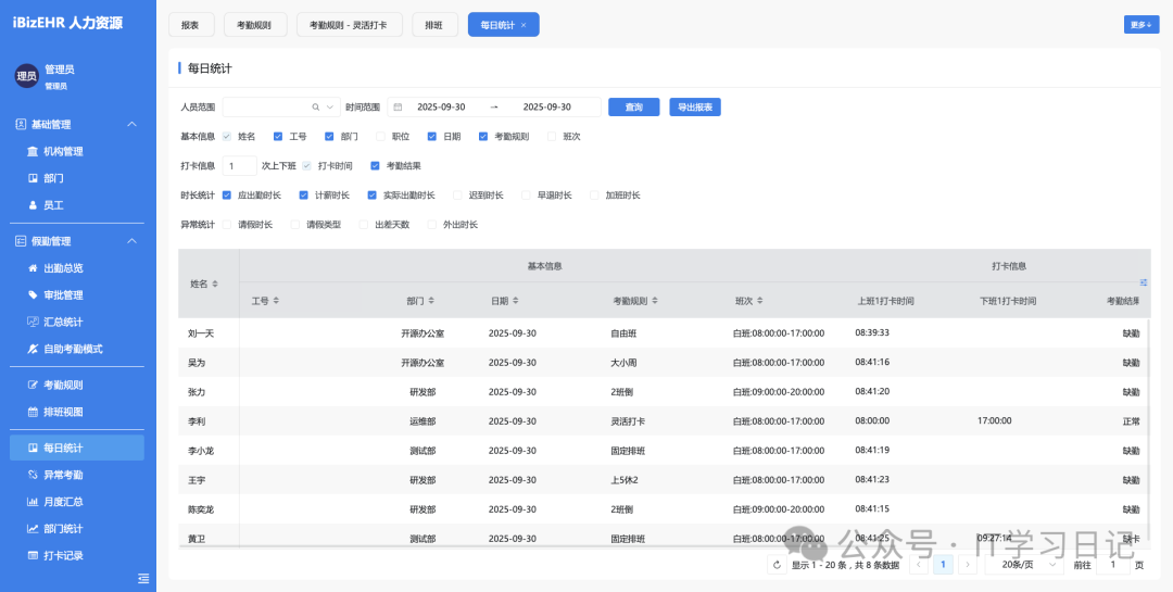 • 自动生成考勤报表与统计分析