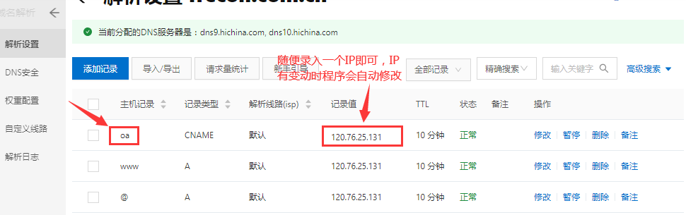本方案只针对阿里云公司购买的域名,阿里云购买的域名支持外挂程序动态修改映射的IP。